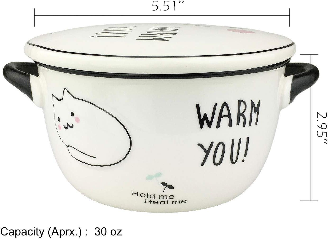 Big Capacity 24oz 3D Cute Cartoon Microwave Ceramic Soup Cat Bowl Instant Noodle Bowl Cereal Bowl for Salad Fruit Vegetable with Ceramic Kitty Cat Lid and Handles (White A)