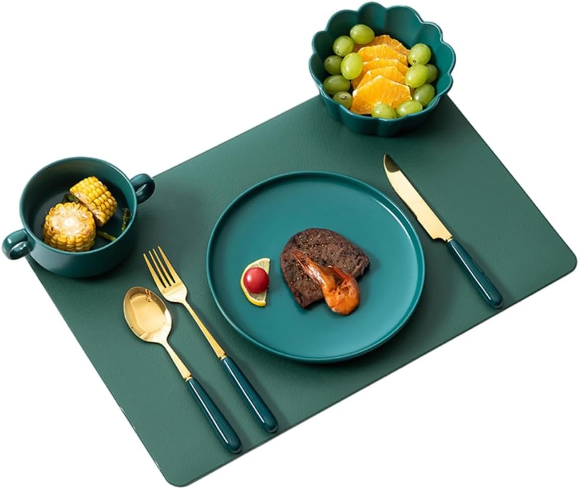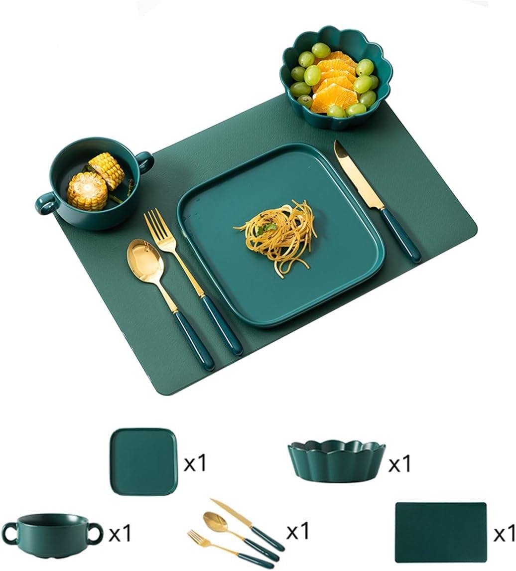 Plate Bowl Fork Knife Spoon Cup and Meal Mat Set for Microwave Safe, Made of Ceramic and Food Grade Stainless Steel Materials for Home/restaurant (1-Person Round Plates,Green)