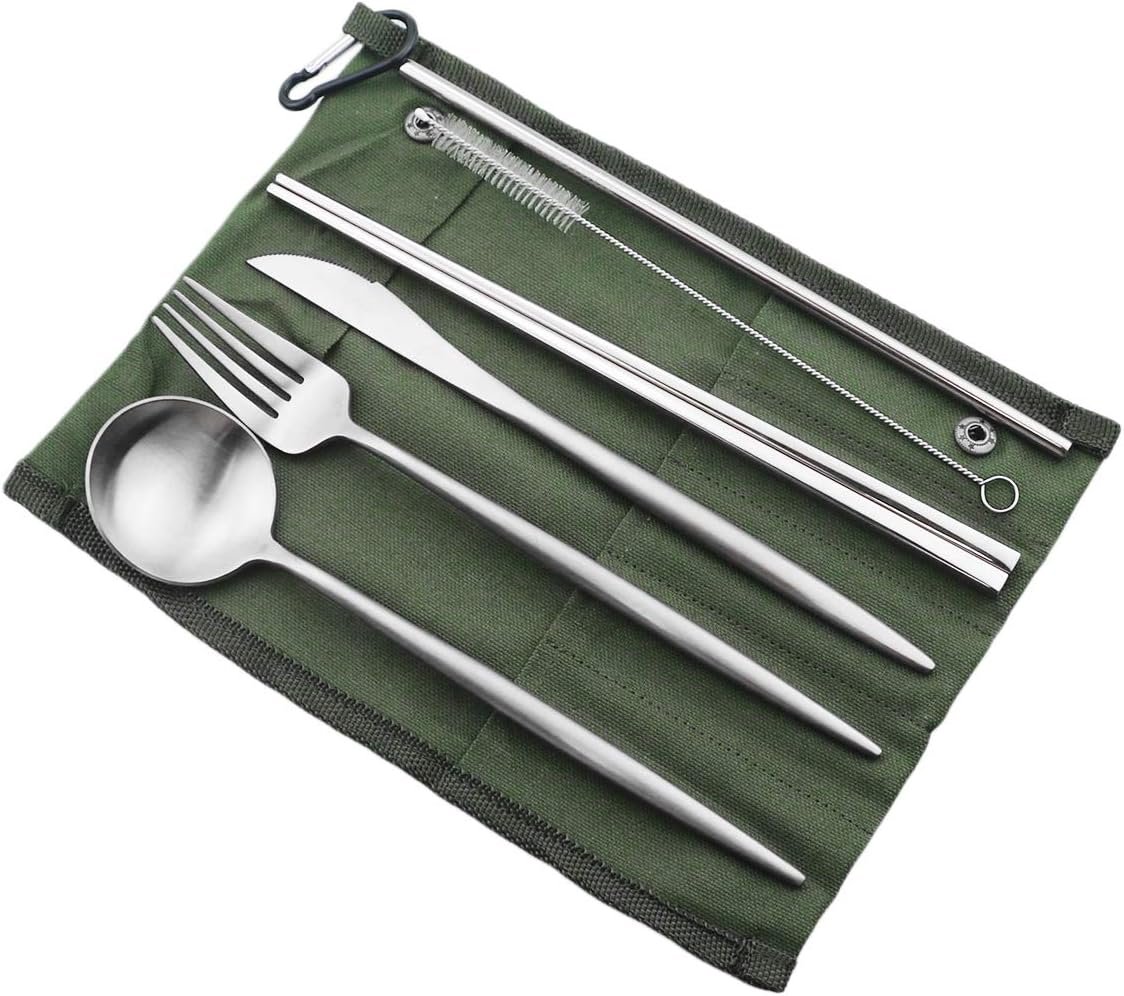 - Perfect Size & 7-Piece Travel Flatware Set Includes – Dinner knife, dinner fork, dinner spoon, chopsticks, cleaning brush, straight straw, carrying case. Suitable for travel, camping, school, flight or workplace.The cutlery is compete in size and light in weight, making it easy to carry around. The 7-piece portable Silverware set is a must-have for daily use, camping, and home travel.