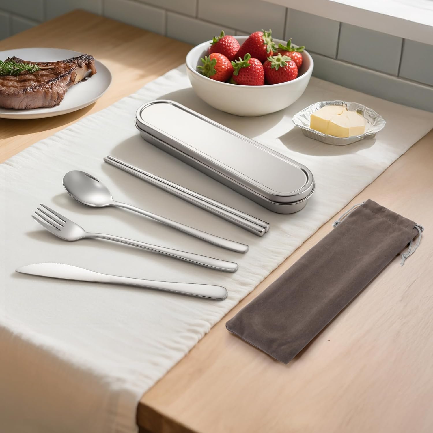 Each set of travel cutlery includes 1 pair of chopsticks, 1 spoon and 1 fork,1 table knife